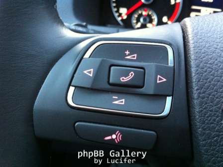 Commande au volant de l'autoradio et du téléphone. Le micro en bas ne fait que couper le son, ou le micro pendant un appel. Cette touche est supposée appeler une commande vocale pour le RNS315 (selon la notice), mais finalement cela n'est pas le cas.