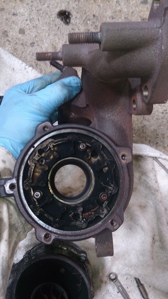 vous aurez donc ca!la c'est l'etape la plus delicate,il faut "decoller" le turbo du collecteur!et pas le choix,c'est maillet ou masse