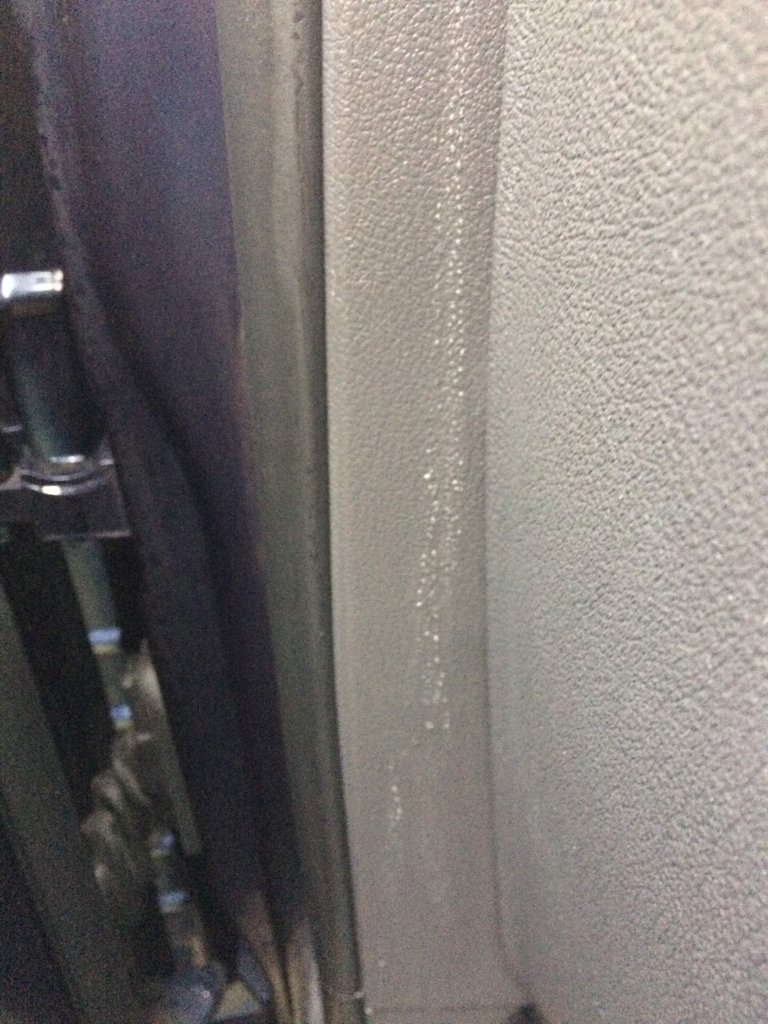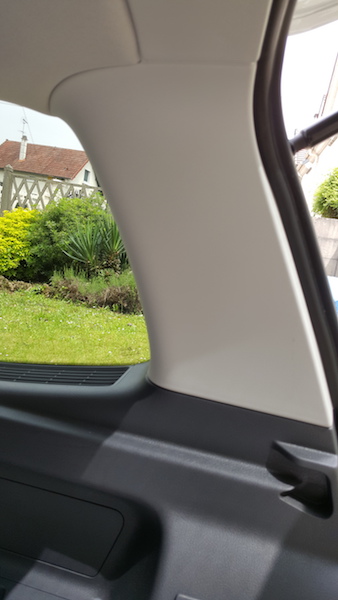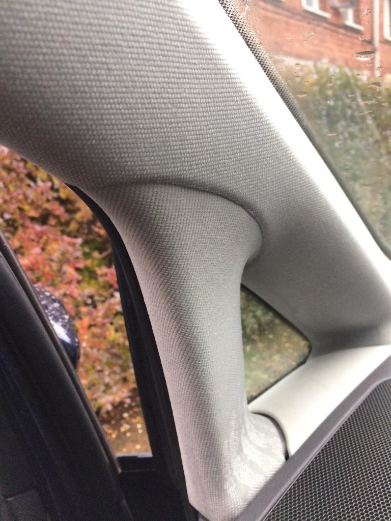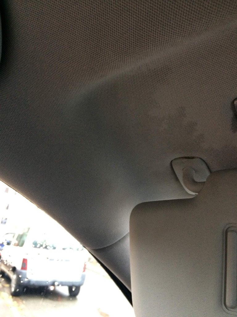 Après les grincements/couinement de mon toit ouvrant (toujours pas réglé), maintenant, c'est des infiltrations!! Ce n'est pas la première fois, mais j'avais mis le coup sur ma femme qui n'avait pas bien fermé sa porte... Mais aujourd'hui, plus de doute, j'étais seul dans l'auto sous l'averse et en 10min j'ai eu ça : (cf. photo).