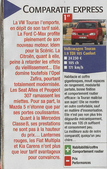 A avoir lu plusieurs comparatifs de monospaces, je pense comme Thomax. Dans ces classements à répétition, le touran varie du meilleur au pire.Thomax*** a écrit :Je ne me fi plus trop à leurs articles.
