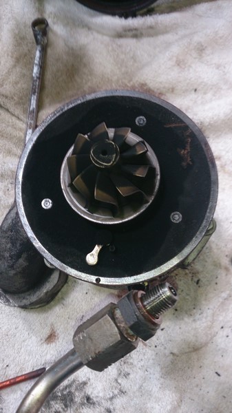 voila l'ensemble turbo+durite huile turbo ouvert et le fameux raccord bloque! ce n'est pas vraiment la suie qui a provoque la panne de turbo,mais plutot une fois de plus une sorte de defaut de conception de ces turbos,les ailettes creusent la contre plaque jusqu'a marquer et du coup ca frotte et se bloque: apres un bon coup de poncage a plat,ca attenue le marquage et c'est bien lisse