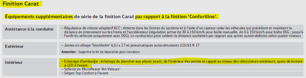 Haaaaaa tu vas me sauver la vie alorsCar on se posait tous la question, avec l'éclairage d'ambiance que j'ai dans le pack Voyage, je disposerais aussi de l'éclairage des poignées de portes, des baguettes et tout le tralala ? Car dans ton extrait de doc, il ne dit pas que c'est réservé à la finition Carat