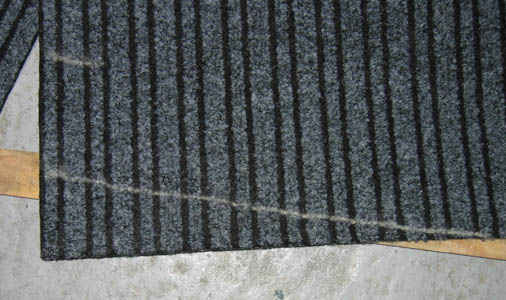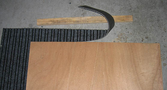 Matériaux : moquette aiguilletée toute simple sans sous-couche. Couleur gris sombre, taille 1m * 2m à 3Eur le m². Et encore un bon paquet de velcro. Un bon cutter et une craie pour marquer les découpes. L'aiguilletée sans sous-couche est un pur bonheur à découper.