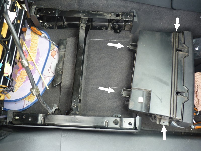 Ensuite on attaque les choses sérieuses: on démonte le siège passager en dévissant les 4 vis étoile taille M20. On obtient ceci: On enlève ensuite le rangement sous le siège qui tient avec 4 vis. 2 sur les côtés et 2 derrière FALCUTATIF