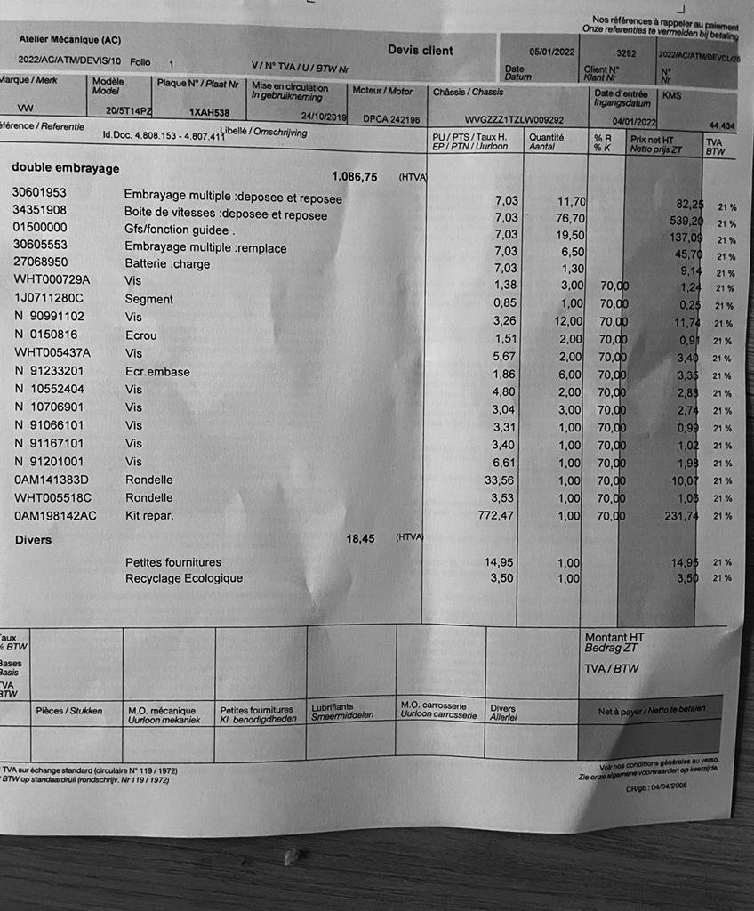 Le garage me notifié à nouveau un rendez-vous pour le 4 janvier 2022, et le lendemain on m'appel en me disant que c'est le double embrayage qui est à changer et le cout est de 1395€ +/-