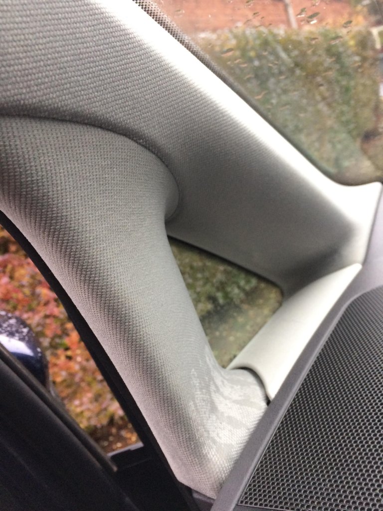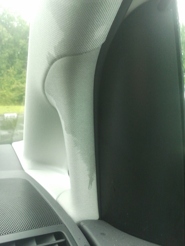 Après les grincements/couinement de mon toit ouvrant (toujours pas réglé), maintenant, c'est des infiltrations!! Ce n'est pas la première fois, mais j'avais mis le coup sur ma femme qui n'avait pas bien fermé sa porte... Mais aujourd'hui, plus de doute, j'étais seul dans l'auto sous l'averse et en 10min j'ai eu ça : (cf. photo).